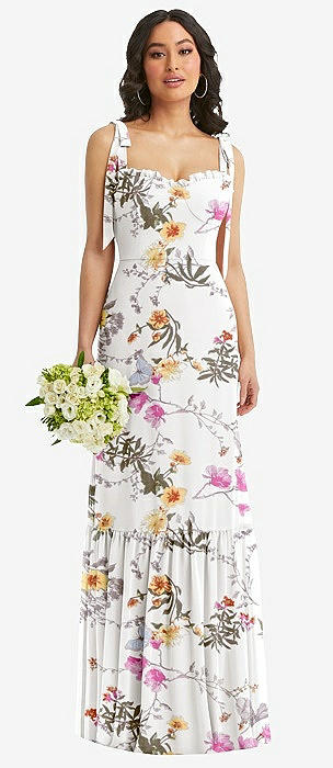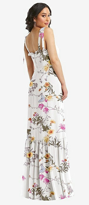 Tie-Shoulder Bustier Bodice Ruffle-Hem Maxi Dress in butterfly botanica ivory