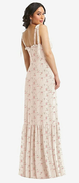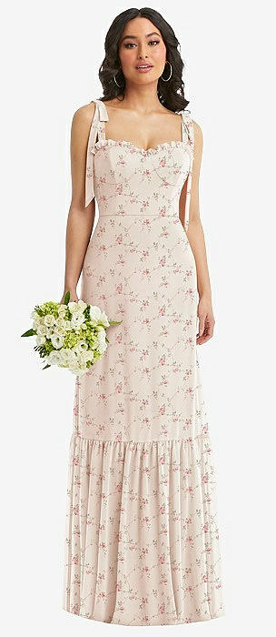 Tie-Shoulder Bustier Bodice Ruffle-Hem Maxi Dress in coquette floral print