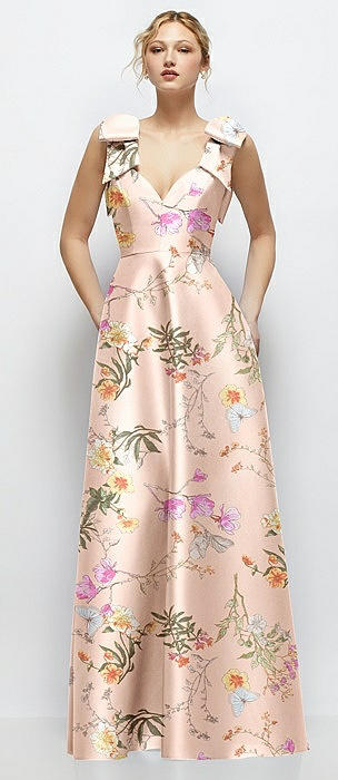 Deep V-Neck Floral Satin Ball Gown with Shoulder Bows in butterfly botanica pink sand
