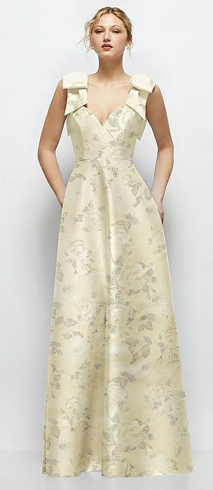 Deep V-Neck Floral Satin Ball Gown with Shoulder Bows in butter yellow floral