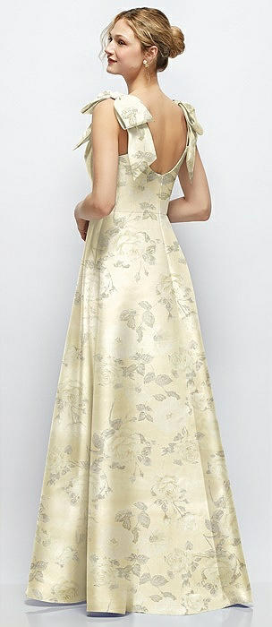 Deep V-back Floral Satin Trumpet Dress with One-Shoulder Cascading Bow in butter yellow floral