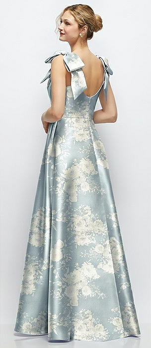 Deep V-Neck Floral Satin Ball Gown with Shoulder Bows in porcelain blue seraphina floral