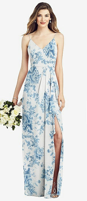 Spaghetti Strap Draped Skirt Gown with Front Slit in cottage rose dusk blue
