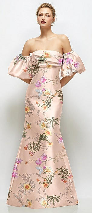 Off-the-Shoulder Puff Sleeve Floral Satin Maxi Dress with Flared Skirt in butterfly botanica pink sand