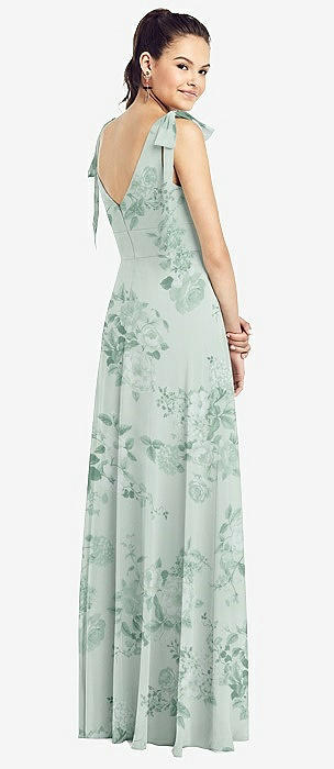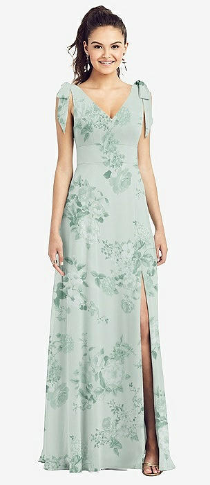 Bow-Shoulder V-Back Chiffon Gown with Front Slit in mint green floral