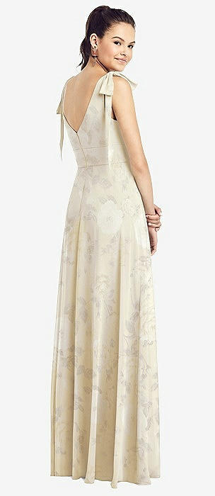 Bow-Shoulder V-Back Chiffon Gown with Front Slit in butter yellow floral