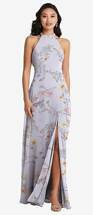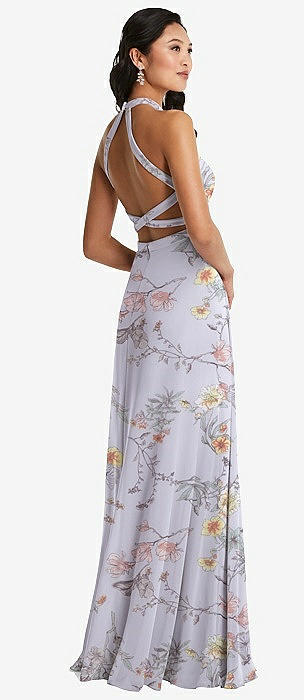 Stand Collar Halter Maxi Dress with Criss Cross Open-Back in butterfly botanica silver dove