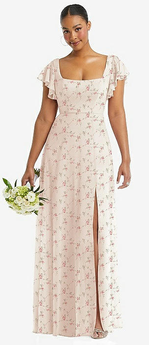 Flutter Sleeve Scoop Open-Back Chiffon Maxi Dress in coquette floral print