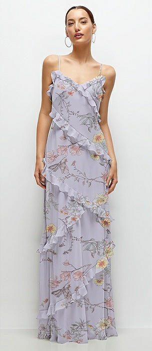 Asymmetrical Ruffle Chiffon Bias Slip Maxi Dress in butterfly botanica silver dove