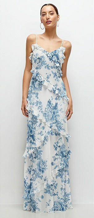Asymmetrical Ruffle Chiffon Bias Slip Maxi Dress in cottage rose dusk blue