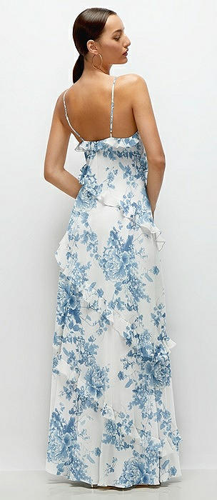 Asymmetrical Ruffle Chiffon Bias Slip Maxi Dress in butterfly botanica ivory