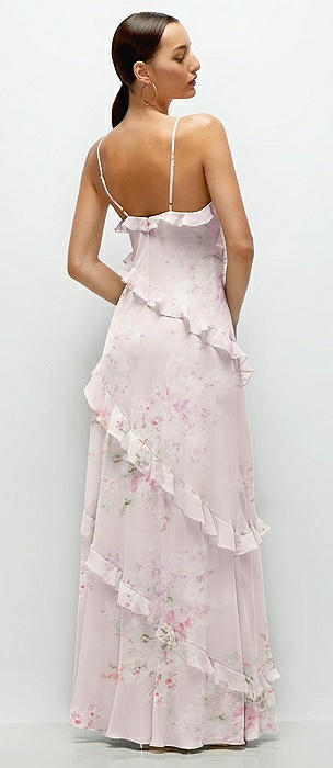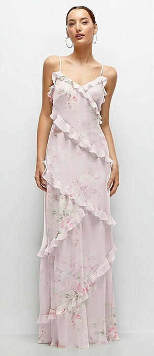 Asymmetrical Ruffle Chiffon Bias Slip Maxi Dress in blush garden