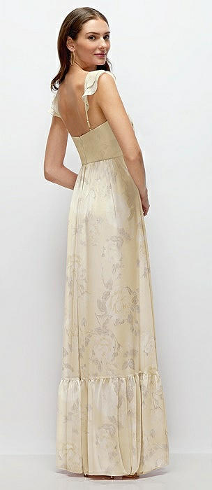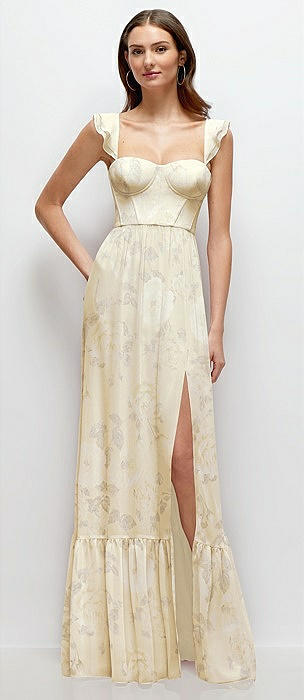 Ruffle Strap Chiffon Bustier Maxi Dress with Ruffle Hem A-Line Skirt in butter yellow floral
