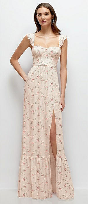 Ruffle Strap Chiffon Bustier Maxi Dress with Ruffle Hem A-Line Skirt in coquette floral print