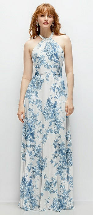 Shirred Halter Chiffon Maxi Dress with Back Sash-Tie Closure in cottage rose dusk blue