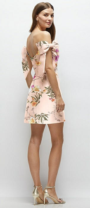 Floral Satin Off-the-Shoulder Bow Corset Fit and Flare Mini Dress in butterfly botanica pink sand