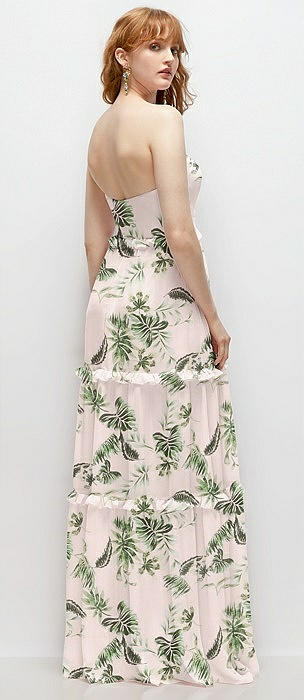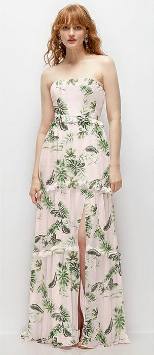 Strapless Chiffon Maxi Dress with Tiered Micro Ruffle Full Skirt in palm beach print