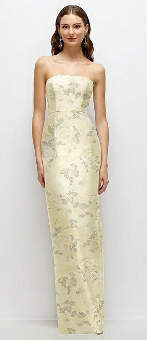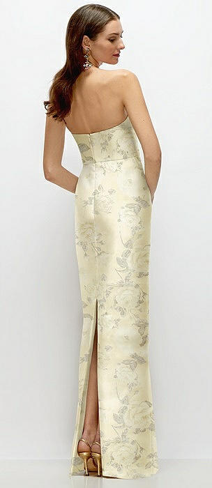 Strapless Floral Satin Column Dress with Back Slit in butter yellow floral