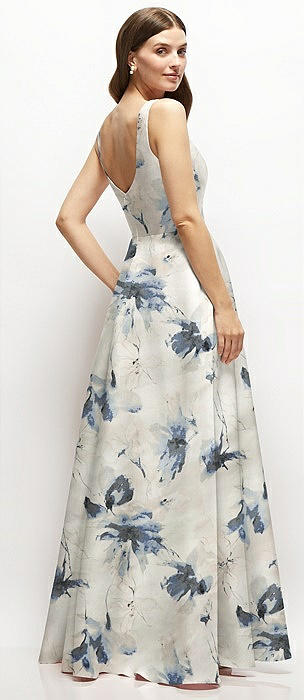 Strapless Bias Cuff Bodice Floral Satin Gown with Pockets in inkwash blue floral