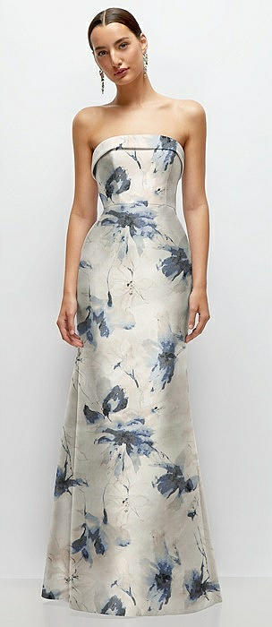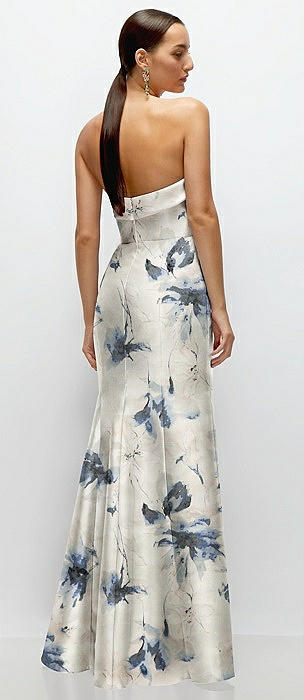 Strapless Cuff Neckline Floral Satin Trumpet Gown in inkwash blue floral