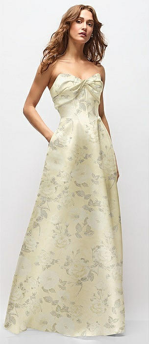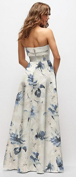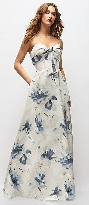 Strapless Twist Cuff Neck Floral Satin Maxi Dress with Basque-Waist & Full Skirt in bow and blossom print
