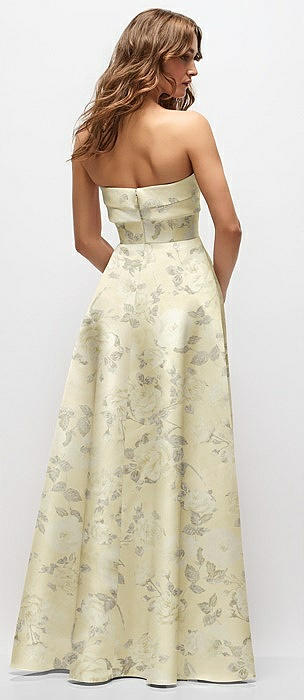 Strapless Twist Cuff Neck Floral Satin Maxi Dress with Basque-Waist & Full Skirt in butter yellow floral