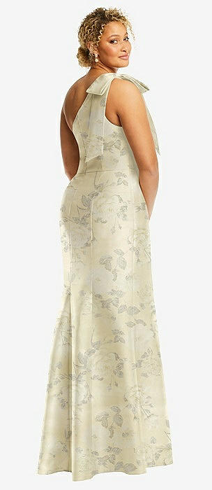 Bow One-Shoulder Floral Satin Trumpet Gown in butter yellow floral