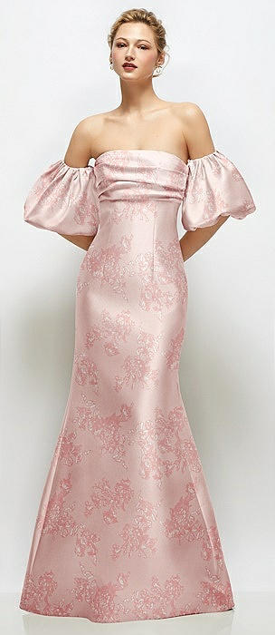 Off-the-Shoulder Puff Sleeve Floral Satin Maxi Dress with Flared Skirt in butterfly botanica pink sand
