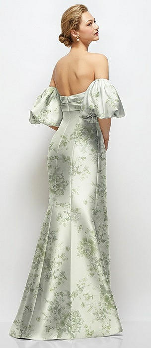 Off-the-Shoulder Puff Sleeve Floral Satin Maxi Dress with Flared Skirt in sage cottage rose