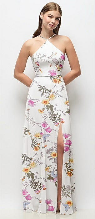 High-Neck Halter Floral Chiffon Maxi Dress with Adjustable Spaghetti Straps in butterfly botanica ivory