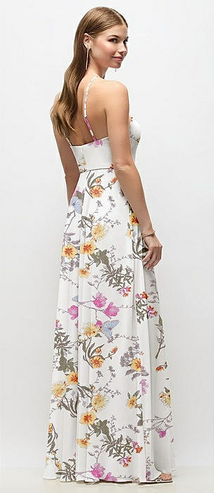 High-Neck Halter Floral Chiffon Maxi Dress with Adjustable Spaghetti Straps in butterfly botanica silver dove