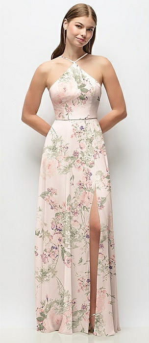 High-Neck Halter Floral Chiffon Maxi Dress with Adjustable Spaghetti Straps in blush garden