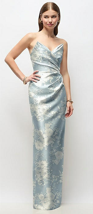 Strapless Pleated U-Wire Floral Satin Column Maxi Dress in porcelain blue seraphina floral