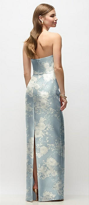 Strapless Cuff Floral Satin Maxi Dress with Column Skirt & Back Bow in cottage rose larkspur