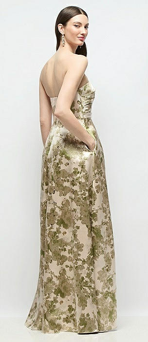 Strapless Pleated U-Wire Floral Satin Column Maxi Dress in sage cottage rose