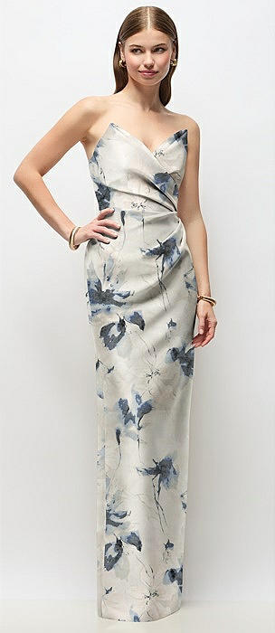 Strapless Pleated U-Wire Floral Satin Column Maxi Dress in porcelain blue seraphina floral