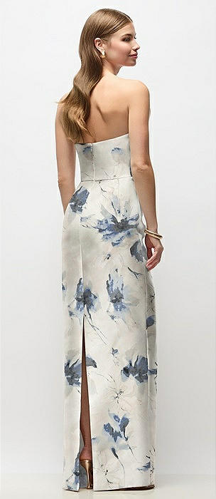 Strapless Cuff Floral Satin Maxi Dress with Column Skirt & Back Bow in cottage rose larkspur
