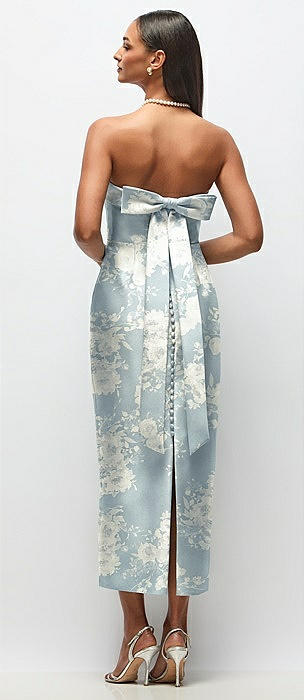 Strapless Cuff Floral Satin Midi Dress with Column Skirt & Back Bow in bow and blossom print