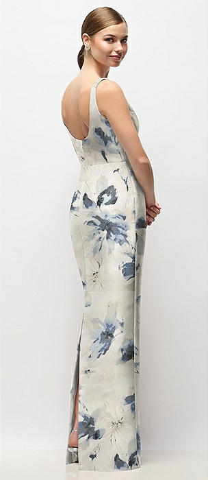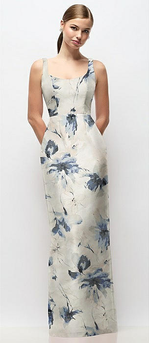Scoop Neck Floral Satin Column Maxi Dress in inkwash blue floral