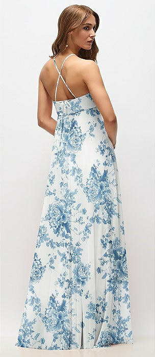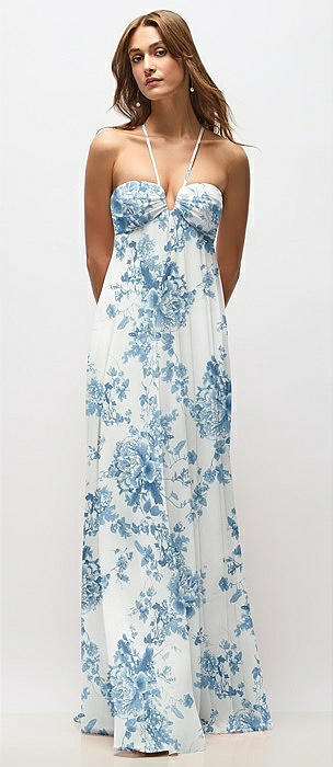 Empire Waist Floral Chiffon Halter Maxi Dress with Convertible Spaghetti Straps in cottage rose dusk blue