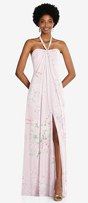 Draped Chiffon Grecian Column Gown with Convertible Straps in blush garden