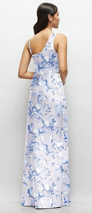 One-Shoulder Draped Cowl A-Line Floral Satin Maxi Dress in magnolia sky