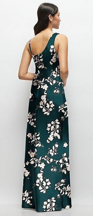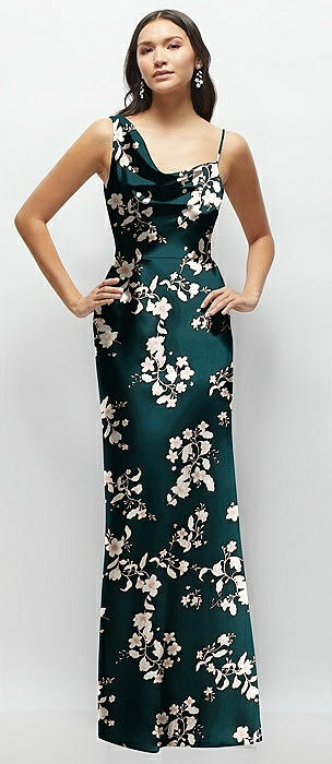 One-Shoulder Draped Cowl A-Line Floral Satin Maxi Dress in vintage primrose evergreen