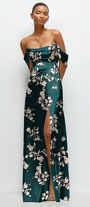 Floral A-Line Satin Maxi Dress with Convertible Off-the-Shoulder or Strapless Looks in vintage primrose evergreen
