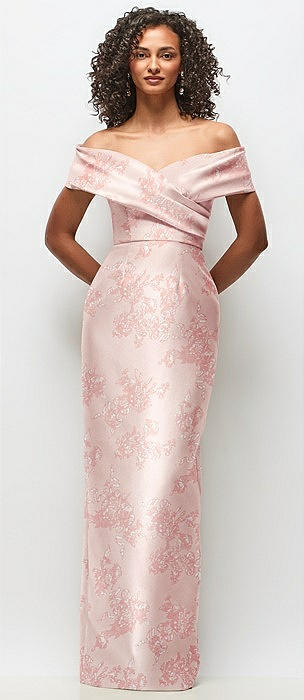 Draped Wrap Off-the-Shoulder Satin Column Maxi Dress in butterfly botanica pink sand