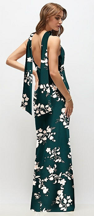 Draped Scarf Halter Open-Back Floral Stretch Satin Bias Maxi Dress with Adjustable Straps in vintage primrose evergreen