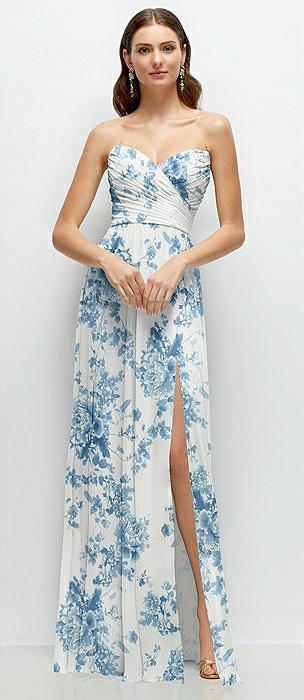 Strapless Pleated Surplice Chiffon Maxi Dress with A-Line Skirt in coquette floral print
