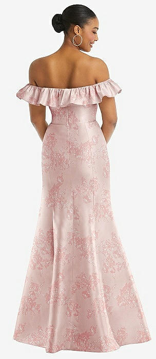 Off-the-Shoulder Ruffle Neck Floral Satin Trumpet Gown in cottage rose larkspur