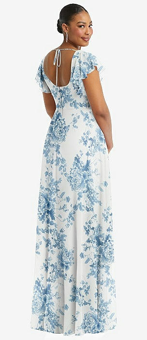 Flutter Sleeve Scoop Open-Back Chiffon Maxi Dress in butterfly botanica silver dove