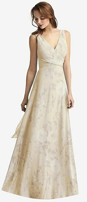 Draped Chiffon Grecian Column Gown with Convertible Straps in butter yellow floral